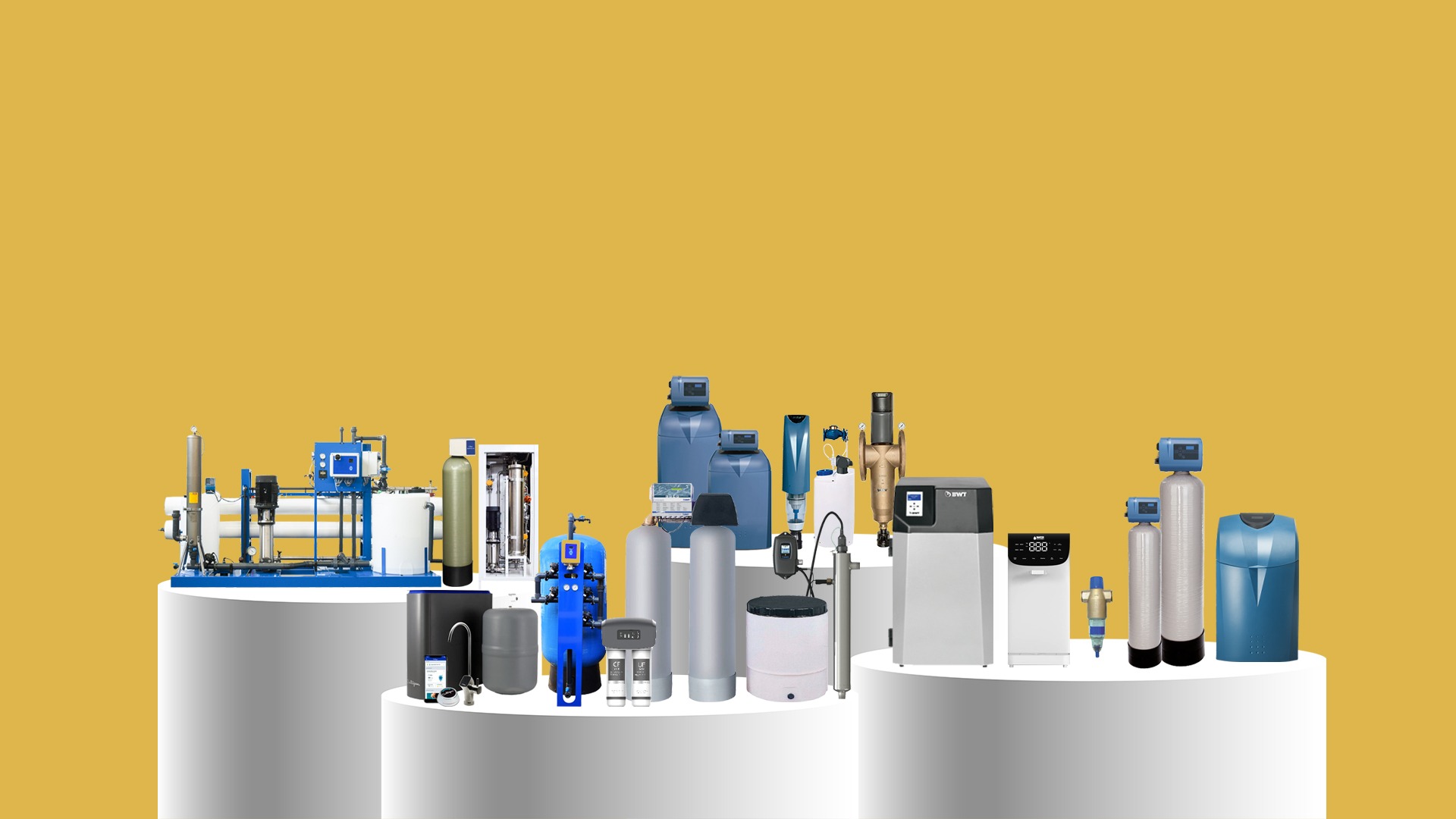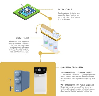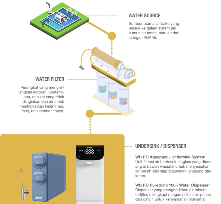 Backwash Filters, Menyaring kotoran kasar dan otomatis membersihkan diri, menjaga aliran air tetap lancar. | Multimedia Filters, Menggunakan lapisan media berbeda untuk menyaring sedimen, bau, dan warna pada air. | Drinking Water Dispensers, Menyediakan air minum sehat langsung siap konsumsi dengan praktis. | Softeners, Mengurangi kadar kapur dalam air, melindungi peralatan rumah tangga dan kulit. | UV Disinfection, Membunuh bakteri dan mikroorganisme dengan sinar ultraviolet tanpa bahan kimia. | Chemical Dosers, Menambahkan bahan kimia dengan dosis tepat untuk menjaga kualitas dan keamanan air. | Reverse Osmosis (RO) Menghasilkan air sangat murni dengan teknologi membran yang efektif. | Drinking Water Filters, Menyediakan air minum yang lebih bersih, sehat, dan kaya mineral penting.