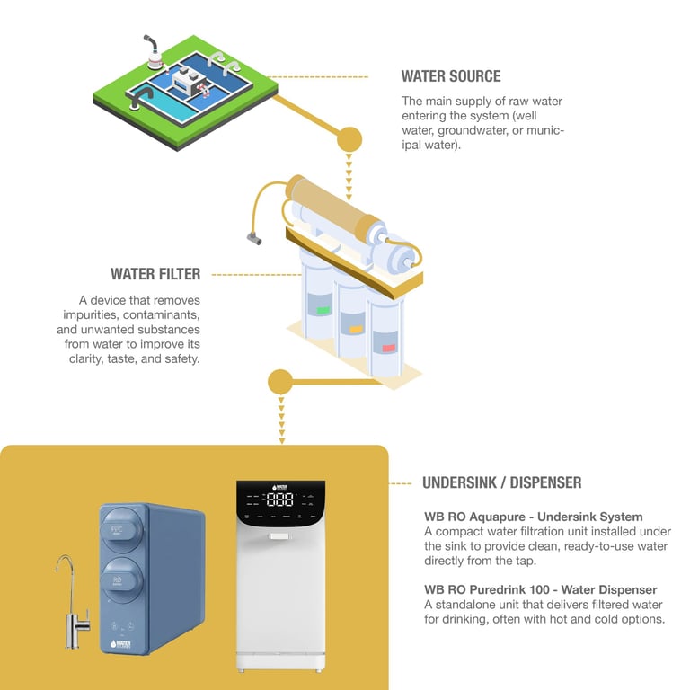 Backwash Filters, Effectively remove coarse particles and sediments while automatically self-cleaning, ensuring consistent performance and uninterrupted water flow. | Multimedia Filters, Utilize multiple layers of filtration media to remove sediments, odors, and discoloration, improving overall water clarity and quality. | Drinking Water Dispensers, Provide safe, healthy, and ready-to-drink water instantly with convenience and efficiency. Softeners | Reduce hardness by minimizing calcium and magnesium content, protecting plumbing systems, household appliances, and even skin from scale buildup. | UV Disinfection, Eliminates bacteria and microorganisms using ultraviolet light, delivering hygienic water without the use of chemicals. | Chemical Dosers, Precisely inject controlled chemical doses to maintain water quality, stability, and safety. | Reverse Osmosis (RO), Produces exceptionally pure water through advanced membrane technology designed for high-efficiency filtration. | Drinking Water Filters, Deliver cleaner, healthier drinking water enriched with essential minerals for better taste and balanced hydration.